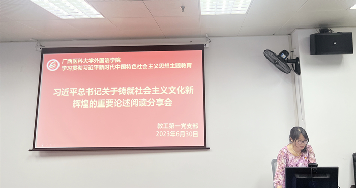 黄爱琼领学《习近平新时代中国特色社会主义思想专题摘编》之“铸就社会主义文化新辉煌”第一部分“文化兴国运兴,文化强民族强”,指出“一个国家、一个民族的强盛,总是以文化兴盛为支撑的,中华民族伟大复兴需要以中华文化发展繁荣为条件”、“没有先进文化的积极引领,没有人民精神世界的极大丰富,没有民族精神力量的不断增强,一个国家、一个民族不可能屹立于世界民族之林”、“我们说要坚定中国特色社会主义道路自信、理论自信、制度自信,说到底是要坚定文化自信。”黄春霞领学《习近平新时代中国特色社会主义思想专题摘编》之“构建人类命运共同体”章节,从“人类生活在同一个地球村里、始终不渝走和平发展道路、建设持久和平普遍安全共同繁荣开放包容清洁美丽的世界、积极发展全球伙伴关系、积极参与全球治理体系改革和建设”四方面解读。臧倩坤领学《习近平新时代中国特色社会主义思想专题摘编》之“以自我革命精神推进全面从严治党”,强调“自我革命精神是推进全面从严治党的内生动力、准确理解和把握自我革命精神的内涵”,指出“习近平总书记着眼党的事业长远发展,深刻审视党自身面临的风险考验,明确提出以自我革命精神推进全面从严治党的要求。他深刻指出,一个马克思主义政党,要保持先进性和纯洁性,实现崇高使命,必须一刻不放松地解决自身存在的问题,始终跟上时代、实践、人民的要求,以勇于自我革命精神打造和锤炼自己。”