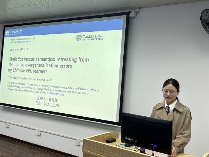首先,向博士围绕团队今年的最新研究成果“Entrenchment and Preemption in L2 Acquisition: Usage-Based Analysis of Overgeneralization in Argument Structure Constructions”进行汇报。该研究考察了250名中国英语学习者克服论元结构构式泛化过程的制约因素,提出了在论元结构构式的习得过程中,二语学习者通过调用统计概率偏向信息来制约论元结构构式的泛化的观点。随后,杨铭超就团队今年发表在Applied Psycholinguistics(JCR分区:1区)上的一篇文献(Statistics Versus Semantics: Retreating from the Dative Overgeneralization Errors by Chinese EFL Learners)进行汇报。该文献探讨了中国英语学习者克服英语与格转换构式泛化过程中的制约因素,提出了二语学习者在克服与格转换构式的泛化问题时不仅依赖统计概率偏向信息,还同时调用了语义信息的观点。翻译专业硕士生杨铭超的汇报展现了良好的科研阅读能力和批判思维,赢得了与会师生的一致好评。